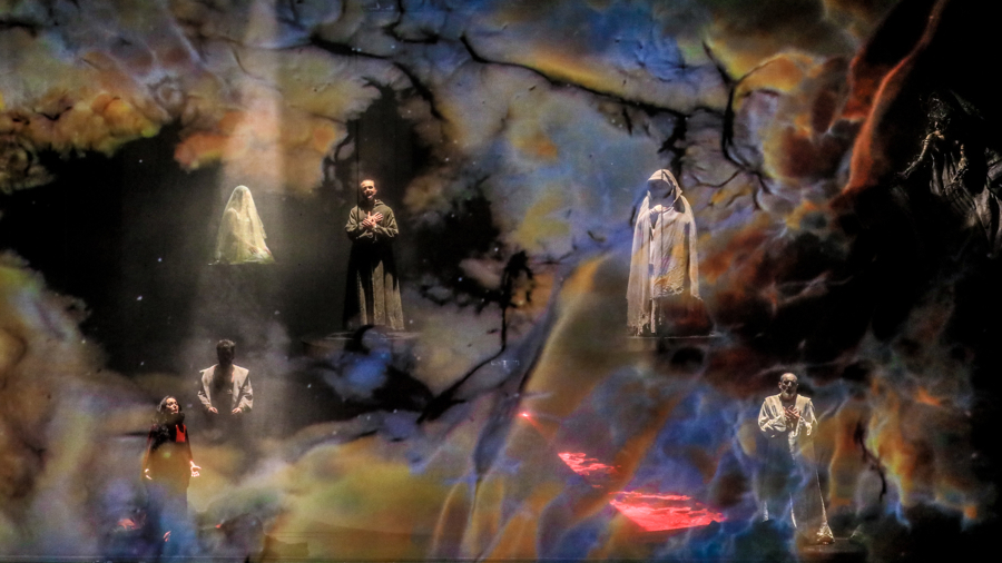 作曲家马尔科·弗里西纳巧妙将古典与现代编曲融合,精准突出剧中最为激烈与戏剧化时刻,唤起但丁笔下场景的神秘与宏伟。全剧分为地狱、炼狱、天堂三个篇章,通过音乐风格转变,精准对应人物情绪与哲学思考。8位意大利歌手驾驭“地狱篇”的撕裂式摇滚高音与“天堂篇”的纯净歌剧咏叹调。